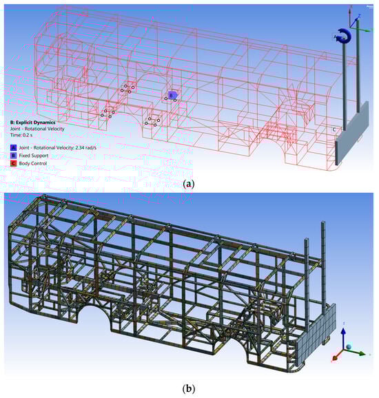 UNECE R29 model of the bus body frame: (a) boundary conditions; (b) FEA mesh.