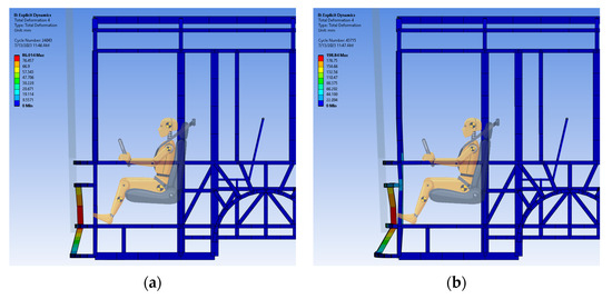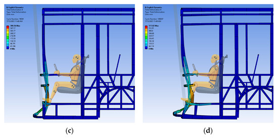 Figure 5. The behavior of the bus body frame front part together with the driver’s position at various moments of impact ((a,b)—35–65 ms, (c)—100 ms, (d)—137 ms). - t = 100 ms (Figure 5c)—the lower part of the driver’s legs is at risk—the pedal unit is clearly deformed, which carries the risk of injury. The maximum observed model displacement is 390 mm at that moment;