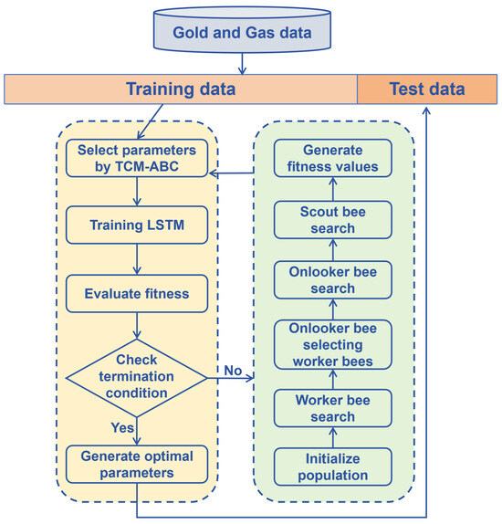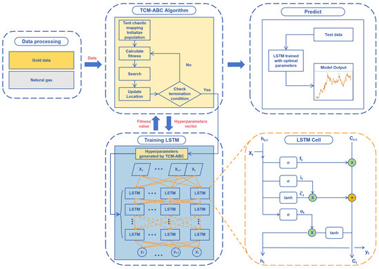 In our study, we enhance the conventional artificial swarm meta-heuristic algorithm by introducing a novel swarm initialization operator, which uses a chaotic mapping algorithm to generate the initial population, and by applying this algorithm to generate optimal hyperparameters for long short-term memory neural networks. Our primary objective is to employ this optimized model to forecast the prices of gold and natural gas futures. This section provides a comprehensive exposition of our model architecture and the methodological approaches employed therein. Figure 1 shows the created TCM-ABC-LSTM model.