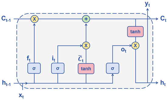 The long short-term memory network stands as a seminal and highly effective model for time series prediction [39]. The memory cell of the LSTM model is shown in Figure 2. The LSTM model incorporates a sophisticated gate structure to mitigate the challenges of gradient vanishing and explosion. This gate structure comprises forget gates, input gates, and output gates, and each structure has its unique role. Three gate structures are represented mathematically by Equations (8)–(11):