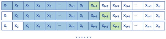 To facilitate this predictive process, we adopt the moving window method, a widely employed technique for feature extraction from observed time series data. The closing prices of the previous t trading days are used in each prediction to forecast the closing price of the following trading day t + 1. This method systematically constructs features and labels by sliding a window over the time series data, as depicted in Figure 4.