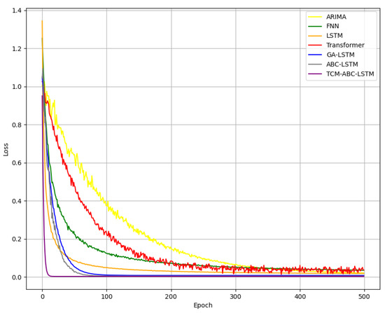 We use the root mean square error to evaluate the prediction accuracy. Taking the prediction of gold prices as an example, each algorithm’s loss function over time is displayed in Figure 5. The graph shows that our suggested algorithm has the fastest convergence speed and can reach the final result within approximately 10 iterations; second, the ABC-LSTM model can reach the final result after about 50 iterations, showing that the effect of our proposed swarm initialization operator on the speed of model training is effectual; and, finally, the Transformer model has the worst prediction performance, suggesting that it has limitations in capturing the intricate volatility patterns inherent in commodities traded on futures markets.
