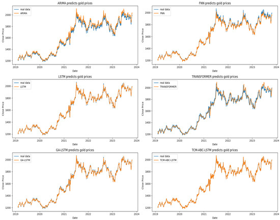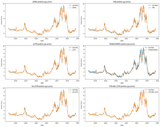 Figure 6 and Figure 7 illustrate how well the ARIMA, FNN, LSTM, Transformer, GA-LSTM, and TCM-ABC-LSTM models predict the prices of gold and natural gas, respectively. It is evident from the graph that the TCM-ABC-LSTM-predicted futures commodity prices closely match the actual data.