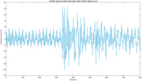 When a water hammer failure occurs, a large-scale impact is generated on the vibration waveform. This shock waveform is more pronounced at the pump outlet and lasts longer. The impact signal detected on the pump body is weak, but the characteristics of water hammer failure can also be extracted. When a water hammer failure occurs, the vibration waveform at the pump outlet is as shown in Figure 1, and the vibration waveform on the pump body is as shown in Figure 2, where the red mark indicates the starting point of the water hammer failure.
