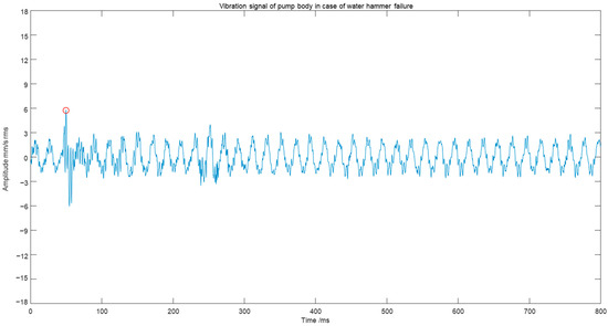 The traditional state monitoring method of centrifugal pumps collects the vibration signal of a centrifugal pump through a sensor, and after filtering, amplifying and A/D conversion by the sensor, the transceiver transmits the data to the server for fault analysis and diagnosis [18,19]. The water hammer signal is a shock signal, so it has transient and occasional characteristics. When the traditional vibration monitoring system works, a set of dynamic waveform data is often collected and uploaded to the server for analysis and processing, and after the results are displayed, the next set of data collection and analysis is carried out. There is a collection interval between two data collections due to data transmission, storage, network delay and other reasons. The interval between the two sets of data is often too large, even longer than the duration of the water hammer time, and it is prone to the phenomenon of missing judgment because the water hammer signal cannot be collected. On the other hand, although the occurrence of water hammer failure is occasional, it is more destructive to the centrifugal pump [20]. Effectively recording the water hammer time is important for improving the design of pipelines and centrifugal pumps, but so far, there is no effective method for the real-time digital monitoring of water hammer failures in centrifugal pumps.