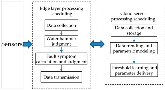 - In view of the problem that water hammer events are difficult to deal with in time, this paper adds edge computing to the data acquisition module, which makes full use of the computing power of the edge layer, reduces the computing pressure of the server and improves the data transmission speed and the processing efficiency of water hammer events.