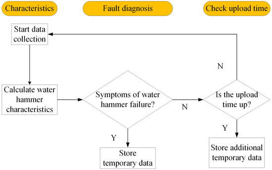 The collector can collect the acceleration sensor signal and perform edge computing in the collector to quickly extract the signs of water hammer in the signal. The water hammer fault has strong occasional and short duration characteristics after it occurs [25,26]. According to these characteristics, the data collection and scheduling method was designed. The method is shown in Figure 5. When each group of data arrives, the collector collects data frame by frame, calculates the characteristic parameters of water hammer and determines whether water hammer has occurred. Specifically, if a malfunction occurs, the set of data in the collector is temporarily stored. If there are no faults, the next collection is prepared, and the final frame of additional temporary data is stored before the upload time to detect other types of faults. The idle time interval between each frame of data is within 1 s to ensure that any water hammer event can be monitored. In this way, the extraction interval of symptom extraction is controlled within 1 s, which effectively avoids omission caused by not collecting symptoms when the water hammer event occurs; the collected vibration data are uploaded to the server through the network. And the server learns and corrects the alarm threshold based on the historical data and sends the learned alarm threshold to the collector. If each group of data is uploaded to the server, it takes up a lot of network bandwidth and storage resources, and most of the data features are similar without significant changes. In addition to water hammer, other mechanical failures of centrifugal pumps have a gradual process, so in terms of uploading collected data, a reasonable time interval can be set, such as uploading once every 30s to reduce the upload frequency and network bandwidth usage.