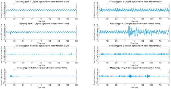 The waveforms of the original signal and filtered signal at measurement points 1 and 2 of the centrifugal pump under normal conditions and water hammer failure are shown in Figure 9. When no water hammer fault occurred, the original signal and filtered signal waveforms of measurement points 1 and 2 showed relatively stable characteristics, and there were no obvious impact signals. At this point, the kurtosis index, pulse index and margin index values of measurement points 1 and 2 were also relatively small.