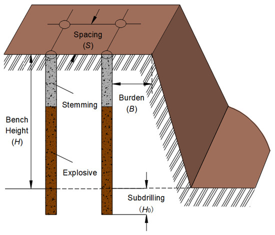 A certain iron mine is located in Yueyang City, Hunan Province, and is engaged in the mining and beneficiation of iron ore. The mining method employed is open-pit mining. The mineral reserve in the mining area amounts to 320 million tons, with an annual production capacity of 2.33 million tons of iron ore. The ore types mainly include magnetite, hematite, and small amounts of limonite. The mine uses deep-hole bench blasting with continuous charge structures. The blasting parameters are shown in Figure 1. The blast hole inclination angle is 90°, and the designed bench height (H) is 12 m. The actual specific charge (q) ranges between 0.33 kg/m3 and 0.54 kg/m3, the burden (B) ranges from 4.0 m to 4.8 m, the spacing (S) ranges from 5.0 m to 5.8 m, and the subdrilling (H0) ranges from 0.5 m to 2.5 m. The wide range of blasting design parameter values indicates a strong reliance on subjective experience.