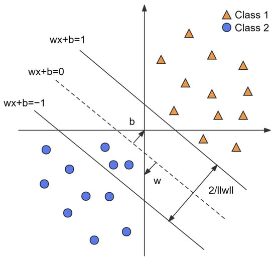 Support vector machine (SVM) is a machine learning algorithm used for classification and regression tasks [31]. The core idea of SVM is to identify a hyperplane that maximizes the margin between classes. This means finding the optimal boundary between two classes such that the distance from the closest points to this boundary is maximized [32]. The schematic diagram of its structure is shown in Figure 2 [33].