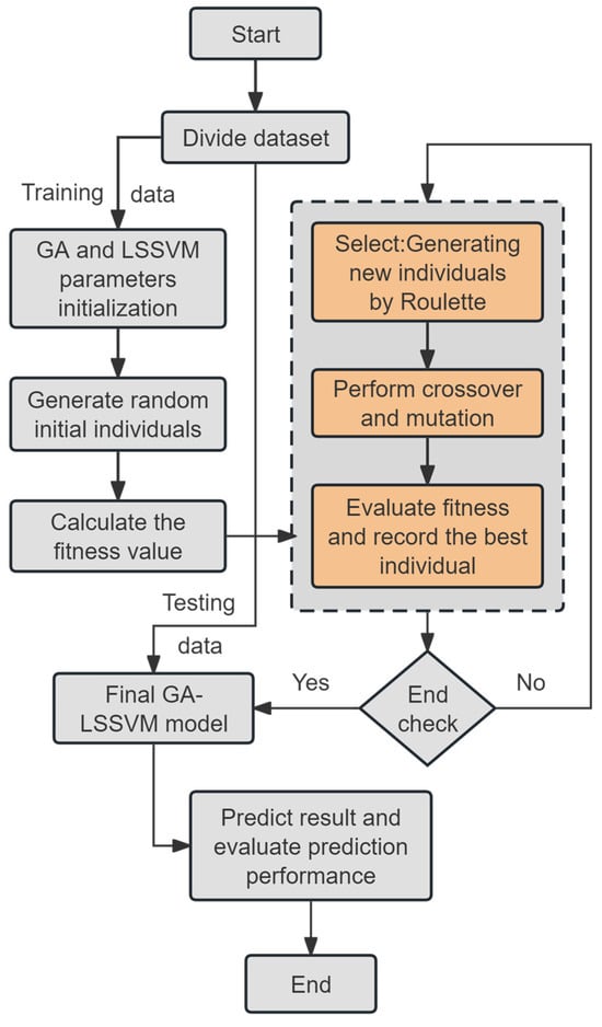 Genetic algorithm (GA) is an optimization algorithm based on natural selection and genetic mechanisms that is used to solve various complex optimization problems [40]. Using GA to optimize the LSSVM algorithm can fully leverage its advantages, such as global search capability, strong adaptability, and ease of parallelization, to find better combinations of model parameters, thus enhancing the performance of the LSSVM model. The process of optimizing hyperparameters in the LSSVM model using GA is illustrated in Figure 3. During the optimization process, the objective function is to minimize the prediction error on the training set, and the RMSE is selected to establish the fitness function, as shown in Equation (6).