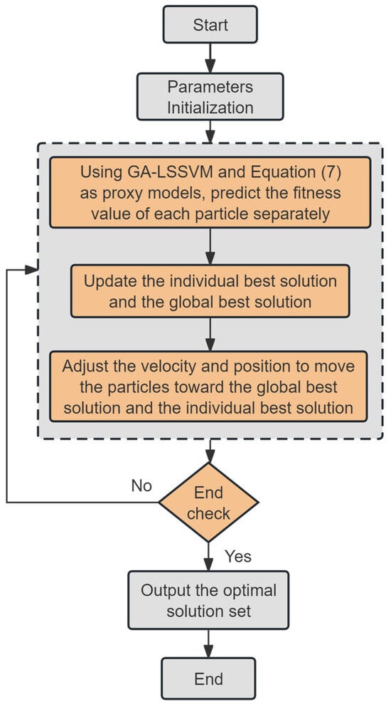In this study, blast fragmentation (P50) and blasting cost (C) are optimized. Therefore, the GA-LSSVM model serves as one of the proxy models. Additionally, the blasting cost calculation model serves as another proxy model, represented by Equation (7) [44]. The optimization process of MOPSO is shown in Figure 4.