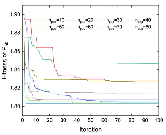 To enhance the prediction accuracy of the GA-LSSVM model, multiple iterations were conducted to determine the maximum number of iterations (Imax) and the population size (npop). RMSE was employed as both the fitness function and the evaluation metric for the predictive model. There exists a negative correlation between prediction performance and RMSE; smaller RMSE values indicate better predictive efficacy. Multiple iterations were performed, as illustrated in Figure 5. After 100 iterations, the minimum RMSE value corresponded to a population size of 60, and stability was achieved after approximately 70 iterations. Therefore, the final choice for npop was determined to be 60. Taking into account iteration redundancy, the value of Imax was set to 90.
