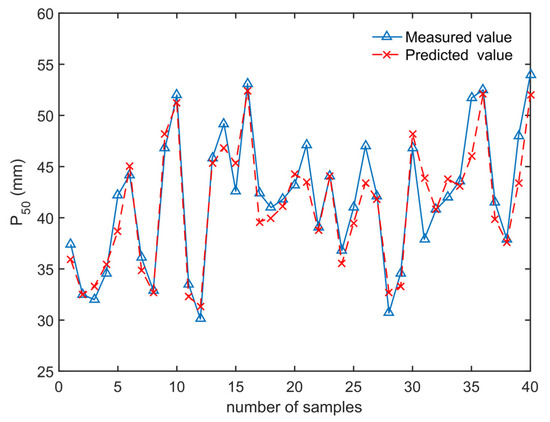 When the blast fragmentation (P50) is taken as the output indicator, the optimal values for and are 468.69 and 287.23, respectively. The regression fitting effect of the final GA-LSSVM model on the sample data is shown in Figure 6. We can see that the predicted values of the model are very close to the test values, with an RMSE value of 1.805. This indicates that the GA-LSSVM model has a good fitting effect on P50.