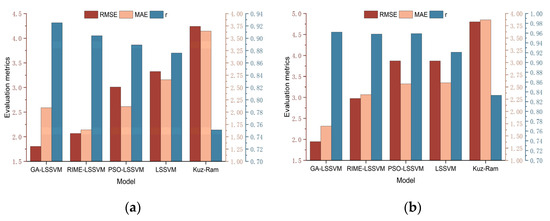 Using the same set of training and testing samples, the prediction performance of RIME-LSSVM, PSO-LSSVM, LSSVM, and Kuz–Ram models was compared with that of the GA-LSSVM model. RMSE, MAE, and r were selected as evaluation metrics for prediction performance.
