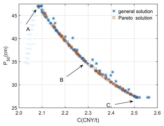 Reducing the size of ore fragmentation in blasting operations can help control hazardous factors and facilitate ore handling. However, smaller fragmentation implies higher blasting costs. Therefore, it is crucial to find blasting parameters that strike an optimal balance between fragmentation and cost. In this section, we established blasting fragmentation and blasting cost models related to blasting parameters, respectively serving as two objective functions for blasting parameter optimization. The Pareto front representing the relatively optimal conditions was obtained. By the 90th iteration, a stable Pareto front was formed, resulting in a Pareto optimal solution set for different blasting design parameters, as shown in Figure 9. The distribution of the optimal solution set in the graph indicates uniformity, demonstrating that the surrogate model obtained accurate optimization results in the MOPSO algorithm.