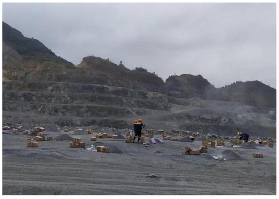 Through the optimization of blasting parameters, Scheme B has been identified as the ideal set of blasting design parameters. Therefore, the optimized parameters were incorporated into the blasting design scheme for this mine, and field verification of the blasting optimization effect was conducted. In the mine area, areas with thick magnetite ore veins and relatively intact rock layers were selected for blasting optimization tests. These include platforms 584, 596, and 608, which were chosen to control the influence of varying rock layer properties. Each platform conducted one blasting test, and a total of three blasting results were analyzed. The blasting design scheme is shown in Table 6. The field operations are illustrated in Figure 10.