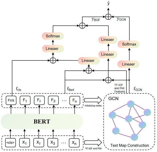 BGF model diagram feature. The model begins by constructing a text heterogeneous graph on the corpus, where document nodes are initialized with BERT embeddings. The edge weights between nodes are determined using word frequency–inverse document frequency (TF-IDF) and pointwise mutual information (PMI) [], which serve as inputs to the GCN. The GCN performs convolutional operations to obtain textual feature representation fGCN in line with the characteristics of the textual graph. This feature representation fBert containing textual information from BERT pre-training is then fused to enhance the model’s understanding of textual semantics. The GCN obtains textual feature representation fGCN, which conforms to the features of the text graph, through convolution operations and merges it with the feature representation fBert obtained from BERT pre-training to enrich the model’s comprehension of text semantics. Subsequently, the output serves as the final representation of text nodes for text label classification prediction through linear layers and classifiers, yielding the final probabilistic representations of the input text, yBAG and yGCN, respectively. These predictions from both parts are then combined.