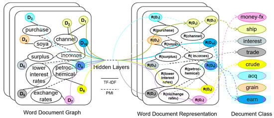 Schematic diagram of text map construction (using the R8 dataset as an example). Word nodes are represented individually, document nodes are represented by Di, and different colors indicate different document categories. The edge between a word node and a document node is constructed based on the word’s occurrence in a document, represented by a black solid line, and its weight is the word’s TF-IDF value in a document. The edge between words is constructed based on the word’s co-occurrence across the entire corpus, represented by a black dashed line in the graph, and the weight is computed using the point-to-point mutual information (PMI) to compute the weights between two-word nodes.