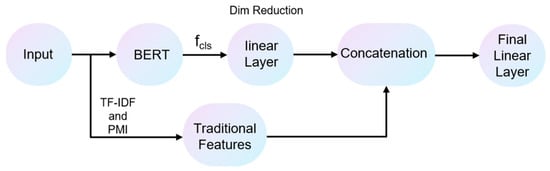 Linear fusion process. First, the output of BERT is spliced with traditional features introduced into a linear layer and then fused through a linear layer. Specifically, the output of BERT is dimensionalized through a linear layer, and then the traditional features are spliced with the dimensionalized BERT output to obtain the fused features. Finally, the fused features are mapped to the category space through a linear layer for subsequent work.