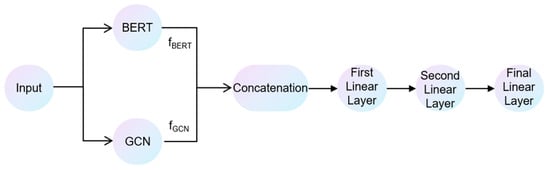 The linear layer is introduced here for two main purposes: (1) Feature transformation and dimensionality adjustment: The linear layer performs a linear transformation on the output from the BERT or GCN part to map the input features to the appropriate output space. This step ensures that features from different sources can be efficiently fused in the same space. (2) Nonlinear transformations: Although the linear layer itself is linear, in practice, it is usually used in combination with nonlinear activation functions (e.g., ReLU, sigmoid, etc.). This combination introduces a nonlinear transformation that enhances the expressive and fitting ability of the model, which, in turn, improves the performance of the model. The process of linear fusion is shown in Figure 4.
