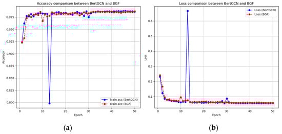 Comparison chart of MR datasets. (a) This is a comparison plot of the accuracy of the BertGCN and BGF models on the MR datasets, where the blue line indicates the accuracy of the BertGCN, and the red line indicates the accuracy of the BGF model. (b) This is a comparison plot of the loss functions of the BertGCN and BGF models on the MR datasets, where the blue line indicates the loss function of the BertGCN, and the red line indicates the loss function of the BGF model.