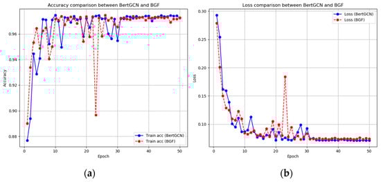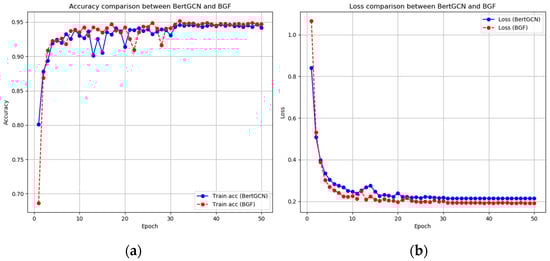 Comparison chart of R52 datasets. (a) This is a comparison plot of the accuracy of the BertGCN and BGF models on the R52 datasets, where the blue line indicates the accuracy of the BertGCN, and the red line indicates the accuracy of the BGF model. (b) This is a comparison plot of the loss functions of the BertGCN and BGF models on the R52 datasets, where the blue line indicates the loss function of the BertGCN, and the red line indicates the loss function of the BGF model.