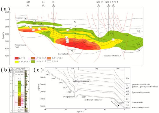 Subsequently, during the Pliocene, the Minghuazhen Formation with a thickness of 2 km was deposited, adding another 2 × 25 MPa of overlying pressure. This pressure also acts on the pore fluid. Since the Minghuazhen Formation dates back approximately 2.1 million years, which is a relatively short period of time, the pore water pressure has not had time to dissipate. Therefore, the final formation pressure is calculated as 52 + 50 = 102 MPa. At this point, the depth is 6 km, and when converted into a pressure coefficient c, it is 1.67, which is basically consistent with actual measurements. Although the Dongying Formation developed lacustrine mudstone, due to the long exposure time of its top surface and the development of coarse-grained sedimentary facies such as braided rivers and meandering rivers in the Neogene Guantao and Minghuazhen Formations, its formation pressure can quickly permeate and form normal pressure. However, the abnormally high-pressure formation water in the Shahejie Formation needs to pass through the thick mudstone layer of the Dongying Formation to completely relieve pressure (permeate). Therefore, in the short term, the Shahejie Formation can still maintain abnormally high pressure. That is, the thicker the covering layer and the better the sealing layer, the longer the time to maintain abnormal pressure, resulting in a higher pressure coefficient as one goes deeper (Figure 1).