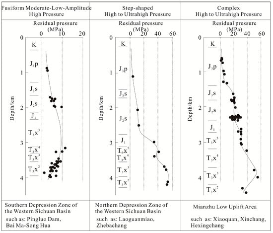 The mainstream view of most scholars currently is that uplift should result in a low-pressure trend. Their main argument is that after uplift, temperature decreases, pressure drops, and rebounding increases pores, leading to an increase in the available space for fluid volume within the pores. According to the formula of state for liquid water, formation pressure would then decrease []. However, these viewpoints do not adequately consider the permeation process of formation water. Both the Wufeng–Longmaxi shale formation and the Triassic Xujiahe formation in the Sichuan Basin commonly exhibit high overpressure, as shown in Figure 2. Essentially, this is the result of recent (Pliocene) rapid tectonic uplift exceeding the rate of water permeation process completion. Similar to the aforementioned active overpressure, the closer the tectonic uplift occurred to the present day, the better, especially during the Neogene and Quaternary periods.