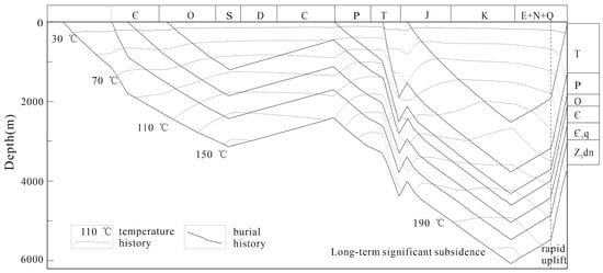 Large uplift and small subsidence refer to a long-term significant uplift followed by a rapid but small-scale subsidence that does not reach the maximum burial depth in history. Taking the Sulige gas field as an example, it is an abnormally low-pressure gas field. Since the Late Cretaceous (about 95 Ma), it has been in a state of uplift and denudation for an extended period, with a relatively slow denudation rate, allowing sufficient time for the internal overpressure to release. Another possible reason is that the Mesozoic strata in the northern Ordos region have relatively coarse lithology, with no development of source rocks and poor capping layers []. The sealing ability of the overlying strata is poor, and the mudstone layers have thinner individual and cumulative thicknesses, leading to rapid water permeation and pressure relief, resulting in low pressure.