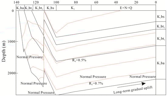 A more important reason may be that the ancient uplifted terrain was higher than it is now. According to the research by Zhao et al. (2009), the Weihe, Yinchuan, and Hetao fault depressions formed successively at the end of the Paleocene to Eocene, and their timing and tectonic patterns are no different from those of the Bohai Bay and other basins in the east. The Shanxi Graben System developed later []. Li et al. (2012) concluded that the Sulige gas field experienced a small-scale sedimentary subsidence during the Neogene []. This means that since the Cenozoic era, there have been fluctuations rather than continuous uplift, resulting in a possible uplift to a higher elevation than present after the Late Cretaceous, followed by a long period of static conditions. After releasing pressure, hydrostatic pressure (normal pressure) was formed, as shown in Figure 5. The shallowest top surface of the P2s in the Shihezi Formation is 3120 m; during the Neogene, there was a small-scale subsidence, and the P2s lowered to 3210 m, not having enough time to adjust by “replenishing water” to the dense He 8 reservoir section and not yet returning to normal hydrostatic pressure, forming the present abnormally low-pressure gas reservoir. In the aforementioned active overpressure model, when a new sedimentary load is added to the original equilibrium state, there is a tendency for pore space to shrink, allowing fluids within the pores to share the load of the overlying strata. However, this does not occur during small-scale subsidence after uplift. Because the latest subsidence did not reach the maximum depth in history (the P2s lowered to 4150 m at the end of the Early Cretaceous, 97 Ma), the organic matter maturity and porosity would remain at their maximum states, and the diagenesis process would stagnate. The fluids within the pores would not share the additional overlying load with the skeleton until the latest subsidence exceeds the original maximum depth, at which point compaction and increased maturity and other diagenesis processes would resume. Therefore, the numerical deviation of abnormal low pressure from normal pressure can be used to qualitatively calculate the relative height of the highest uplift during geological history compared to the present. The formula is as follows:
