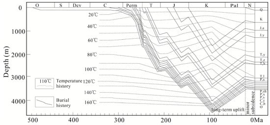 Burial history of well Ba 5 in the Erlian Basin, the red dotted lines in the figure show temperatures history [].