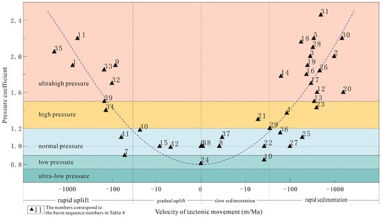 Refer to Table 4 for more examples. The data in the table are plotted on a semilogarithmic coordinate system of tectonic movement rate v and pressure coefficient c to illustrate their correlation. Positive values represent deposition or subsidence, while negative values represent uplift and erosion. More than 50 famous large basins or regions, both domestically and internationally, were collected. Among them, only 43 basins with both stratigraphic pressure data c and tectonic movement rate v were retained [,,,,,,,,,,,,,,,,,,,,,,,,]. The data were directly plotted without any filtering, as shown in Figure 8.