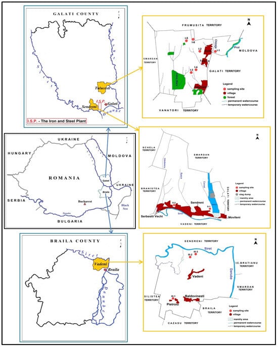 The research was carried out in three administrative territorial units (AUTs) from the south of Galati (GL) County (Tulucesti (TUL) and Sendreni (SEN)) and north of Braila (BR) County (Vadeni (VAD)), southeast of Romania, in some agricultural territories from the Lower Danube Basin, which are near the Iron and Steel Plant (I.S.P.) industry (Figure 1) []. This area is geographically located in the Covurlui and Siret Plains and is characterized by quaternary loess and loessoid deposits of eolian origin, as well as fluviatile deposits. These deposits are the parent material for the prevalent soil types in this area, namely chernozems and fluvisols.