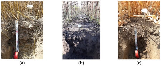 Soil sampling pits from crop allotments: (a) wheat, (b) sunflower (c) corn.