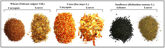 Samples of crop grains/seeds and leaves after cleaning and drying.