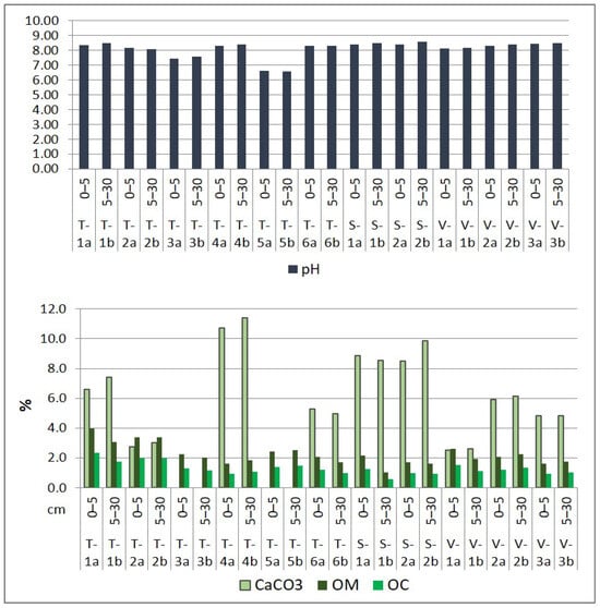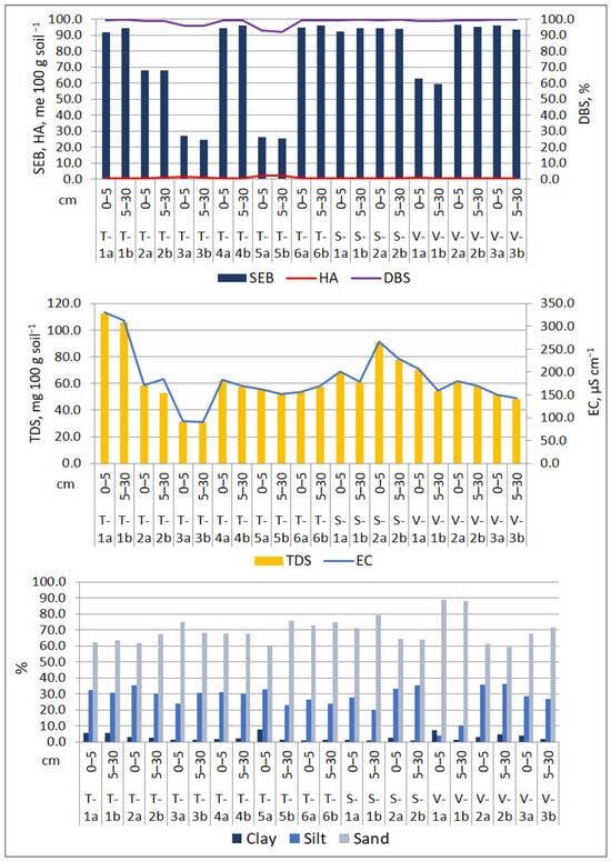 The soil’s natural exchanges with the plants it supports are influenced by the following soil parameters: pH, CaCO3 content, SEB, HA, DBS, OM, OC, TDS, and soil texture. Soil main properties of the investigated soils are presented in Figure 4. The role of soil parameters in retaining and releasing nutrients and harmful elements is widely recognized. Humus, a vital component for soil fertility, enhances soil structure and water retention, directly impacting the availability of nutrients []. The soil’s pH plays a crucial role in plant development, influencing nutrient uptake and the movement of both toxic and non-toxic metal ions [,,]. Even at low concentrations, dissolved salts can hinder plant growth and nutrient absorption. Furthermore, the distribution of sand, silt, and clay in the soil affects the absorption and availability of major and minor chemical elements. Each soil texture type possesses unique water retention and nutrient-holding capacities [,].