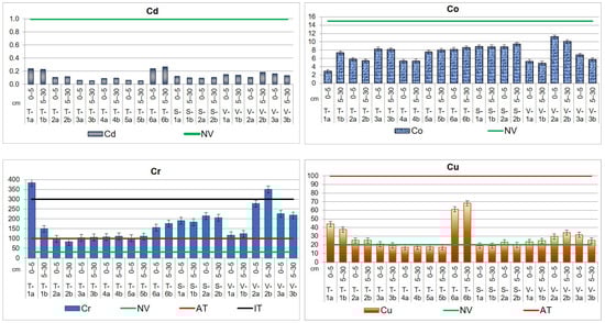 In the three targeted ATUs, chromium exhibits the NV, and AT is even higher than the IT in several locations. Thus, the highest values were obtained for T-1a and V-2b, evidencing a high contamination. Most samples registered concentrations beyond the AT, and their Cr values ranged as follows: 102.0–175.5 mg kg−1 (TUL), 183.5–215.4 mg kg−1 (SEN), and 117.1–277.4 mg kg−1 (VAD).