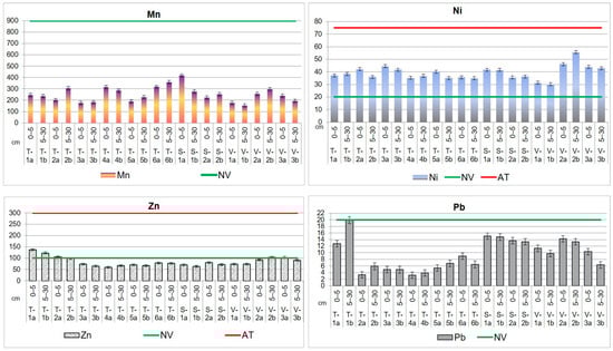Soil levels of contamination in the top layer’s sections, expressed in mg kg−1 dry weight (d.w.), are illustrated in Figure 5, together with the normal value (NV), alert threshold (AT), and intervention threshold (IT) specified by Romanian legislation (Table 4).