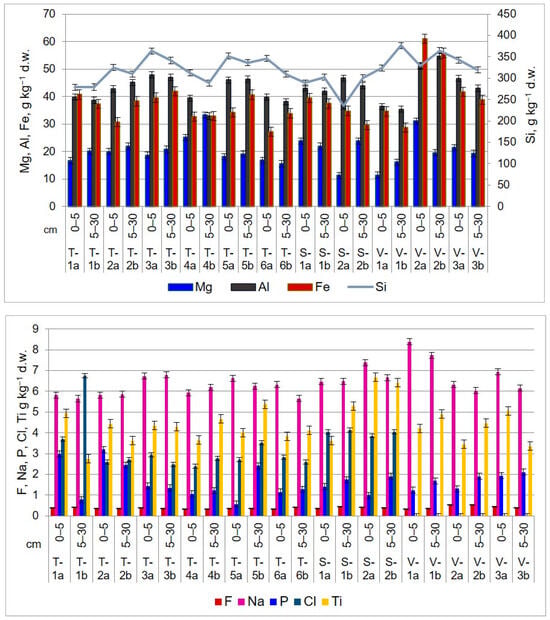 In the TUL region, sodium levels in the 0–5 cm layer range from 5.8 to 6.7 g kg−1, while in the 5–30 cm layer, they vary from 5.6 to 6.7 g kg−1. Aluminum content ranges between 39.7 and 47.8 g kg−1 (0–5 cm) and 32.8 and 46.3 g kg−1 (5–30 cm). Silicon concentration in the first soil section is between 278.5 and 363.8 g kg−1, while in the second soil section, it ranges from 279.1 to 341.3 g kg−1. Chlorine shows the lowest content values compared to other elements. In the first 5 cm layer, it falls within the range of <2.4–<3.7 g kg−1, while in the second layer, it varies between <0.2 and <6.7 g kg−1.