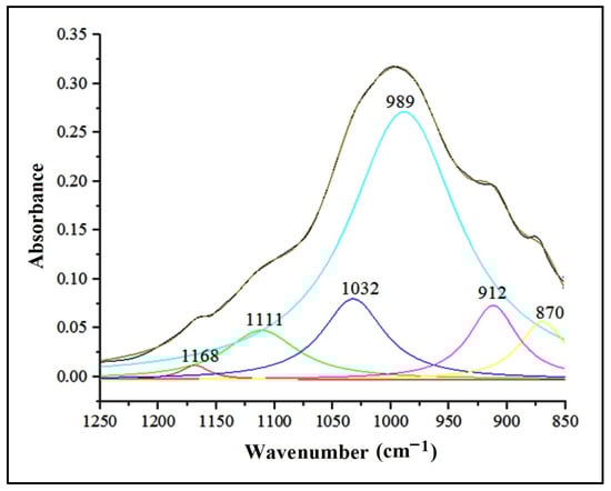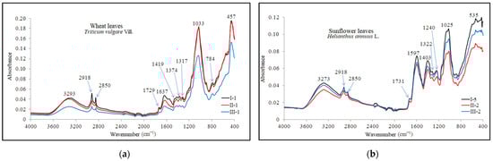 The mineralogical compositions of soil and chemical groups in plant structures were analyzed using the ATR-FTIR method, with assistance from a Bruker Tensor 27 FTIR spectrometer that featured an ATR unit coupled with a diamond crystal. Soil and plant samples, prepared as described, were put as a thin layer onto the ATR device. Background correction was performed, and spectra were recorded as an average of 32 scans per analyzed sample within the range of 4000–400 cm−1 and at a resolution of 4 cm−1. Separation of the overlapping bands found into the complex 1250–850 cm−1 absorption band was obtained by deconvolution using OriginPro 2016 (version 9.3.226) software. Curve fitting was performed by setting the number of component bands found by second derivative analysis and Lorentzian profile.