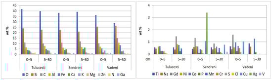 The results were compared with the average values of major and trace element content presented in Table 4, synthesized after [,,,,,,].