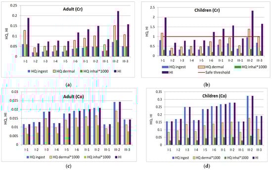 The RfDi reference values were considered according to [] as follows: RfDingestion—Cd (1.00 × 10−3), Cr (3.00 × 10−3), Ni (2.00 × 10−2), Co (3.00 × 10−4), Cu (4.00 × 10−2), Pb (3.50 × 10−3), and Zn (3.00 × 10−1); RfDdermal—Cd (1.00 × 10−5), Cr (6.00 × 10−5), Ni (5.40 × 10−3), Co (1.60 × 10−2), Cu (1.20 × 10−2), Pb (5.25 × 10−4), and Zn (6.00 × 10−2); and RfDinhalation—Cd (1.00 × 10−3), Cr (2.86 × 10−5), Ni (2.06 × 10−2), Co (5.71 × 10−6), Cu (4.02 × 10−2), Pb (3.52 × 10−3), and Zn (3.00 × 10−1).