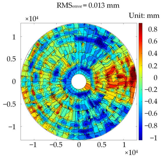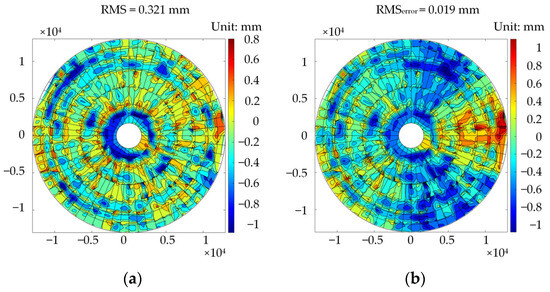 - The optimized parameters are used in place of the original parameters in the FE model to calculate the RMS of the BUS upper chord nodes’ half-path length errors, which is compared with the RMS of the antenna primary reflector surface nodes’ half-path length errors to test the model updating effect [22].