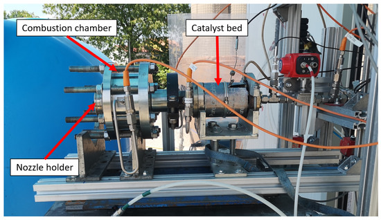 The oxidizer injection was altered by changing the vortex injector cup. This metal part is installed on the flange between the catalyst bed and the combustion chamber. For an axial oxidizer injection, a metal ring is assembled in place of the swirl injector.