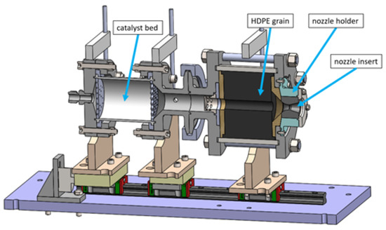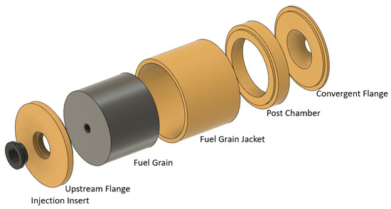 The vortex injection plate is placed inside the inlet flange of the motor case. The combustion chamber parts (e.g., fuel grain, post chamber and thermal protection, TP) are bonded together using a silicone filler. These assembled consumables form the so-called motor cartridge, which can be easily integrated and removed from the cylindrical metal case. The nozzle holder is screwed to the outlet flange with a silicon O-ring, ensuring the sealing from the combustion gases.