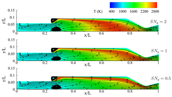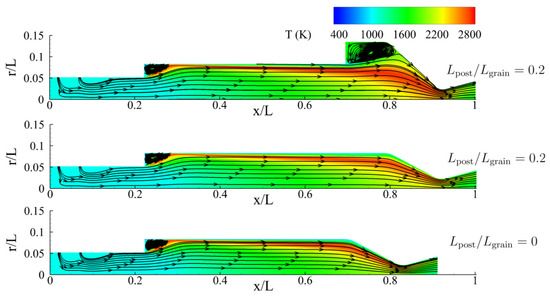 37]. The resulting flow field increases the convective heat flux and the turbulence magnitude inside the combustion chamber. Thus, much higher values of the regression rate (several times’ increase) and efficiency (above 90%) can be achieved [