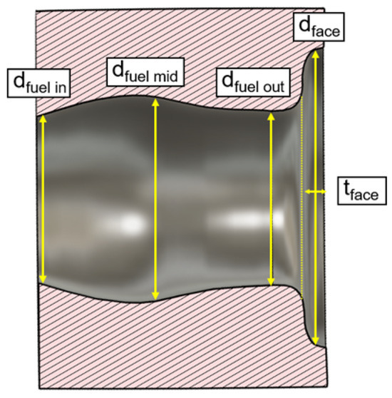 The grain web thickness burnt during the test is computed using the measurement of the fuel final port diameter (). However, the degradation of the grain port is not constant along the longitudinal axis. Furthermore, also the rear face is consumed, especially in the cases where the post chamber is present. So, along the grain port, the diameter is measured in three different points; moreover, in the case of rear face consumption, its diameter and depth are taken. It is important to emphasize that the average of the diameters along the grain port and the quantity of fuel burned less the mass calculated from the face consumption are utilized during post processing to obtain the regression rate constant a. Consequently, rear face consumption is seen as a continuous fuel injection during the burn that is independent of port diameter erosion.
