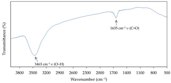 Figure 1 shows the FTIR spectrum of the ACCS, which shows a rather simple course. The spectrum contains only two well-defined peaks at 3463 cm−1, corresponding to the -OH vibrations of the phenolic group; and at 1635 cm−1, which can be attributed to the C=O stretching vibrations of aldehydes, ketones, and carboxylic acids [40,41]. A similar course was observed in the case of the activated carbon used for the phosphate removal presented by Wang et al. [42] and the activated carbon used for the synthetic dye removal presented by Unugul and Nigiz [43]. The relatively low number of observed peaks may indicate a high conversion temperature, which unfortunately was not declared by the producer. According to Allwar [44], the intensity of the bands between 1234 and 1153 cm−1 decreases with increasing temperatures used for the activated carbon preparation.