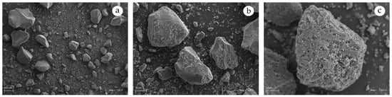 The SEM images taken at different magnifications are presented in Figure 2. As the micrographs taken at lower magnifications show, the activated carbon particles had a regular shape and a rather smooth surface without the cracks, crevices, and large holes noticed previously, for example, by Saka [45]. The images taken at greater magnifications showed the visibly porous morphology of the activated carbon surface. This seems to be advantageous because high porosity indicates a high formaldehyde adsorption capacity [46].
